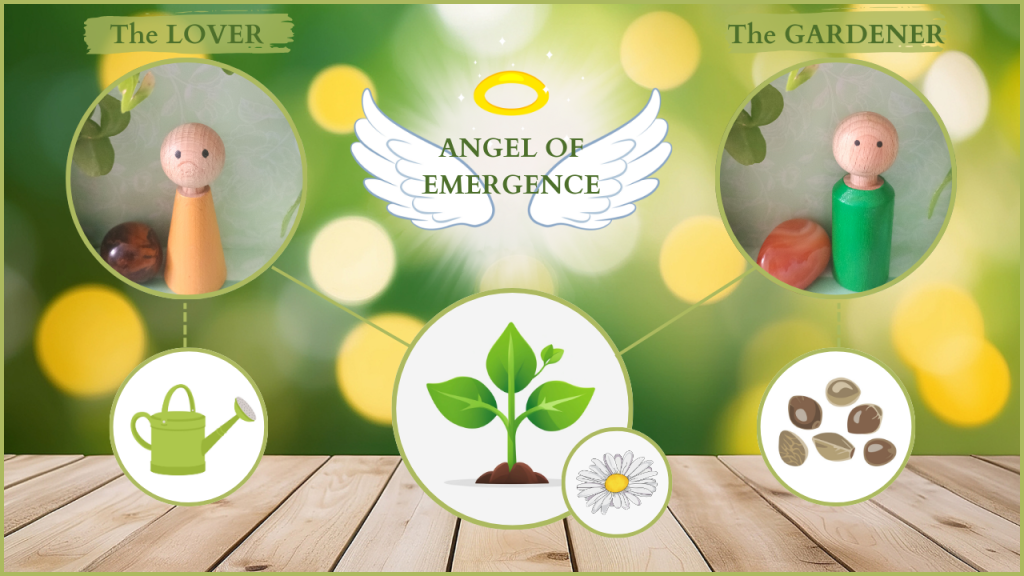 This relationship reading is guided and inspired by the angel of emergence. This beautiful angel announces the arrival of a season of fertility and growth, where the archetypes of the lover and the gardener will start to see tangible results of their shift in energy and their rise in vibration. For this reading the angel of ermergence helped me to intuitively pick out two wooden figurines in different colours. The yellow one on the left represents a female energy with the archetype of the lover and the green one on the right represents a male energy with the archetype of the gardener. On a soul-level there are no genders like there are on the physical plane, so the mentioned male and female energy can apply to a man and a woman, but this does not necessarily have to be the case, and as I mentioned in the introduction, these archetypes can also apply to our inner divine masculine and feminine energies if we choose to interpret this reading as an inner balance reading.