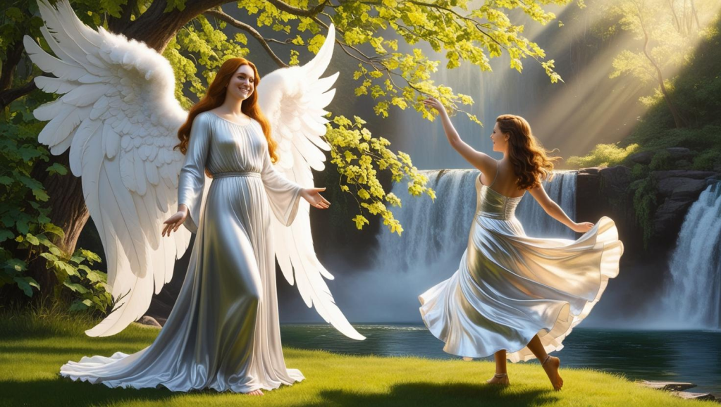 The angel beckons her to come toward her and she gently helps the woman clean away the mud and debris with the clear and bright water of the waterfall. To the woman’s surprise the roaring water of the waterfall flowing over her body does not feel cold or unpleasant at all. As she closes her eyes and listens to the splashing sounds of the water around her, a sensation of pureness, freshness, and renewal washes over her. Then the angel of inner calmness slowly guides her away from the waterfall and dresses the woman in a beautiful silver garment. The woman smiles and twirls in delight, causing her new clothes to sparkle in the sunlight and rustle in the wind.