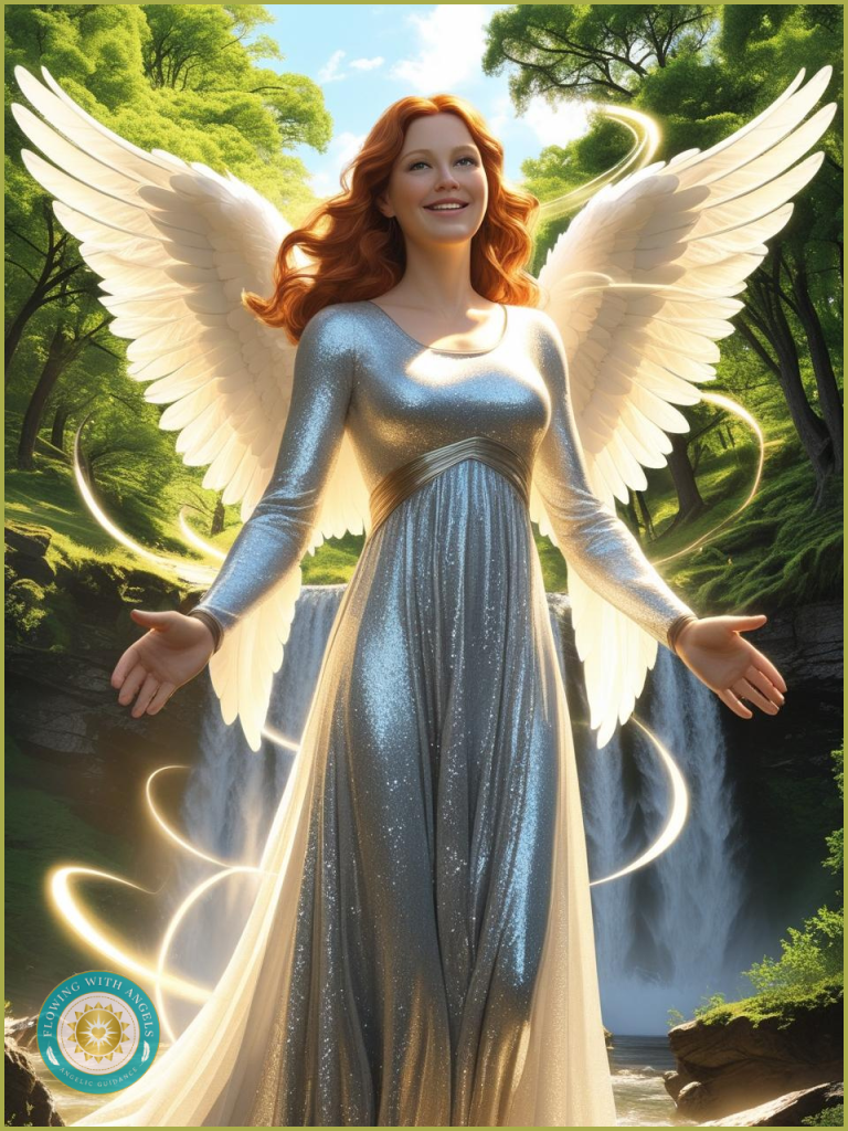 The angel of inner calmness appears in a vision set in a clearing in a vast forest area. A magnificent waterfall is flowing down behind her, creating foamy water bubbles around her feet. The angel’s silver gown catches glimpses of sunlight peeping through the trees, which enhances the bright and sparkly aura that surrounds her. In contrast to the lightness of her appearance, her hair is of a fiery deep orange colour, curling down over her shoulders. She stretches out her arms to the sides, allowing the water to glide through her hands. The angel of inner calmness then closes her eyes and smiles in anticipation of her next visitor.